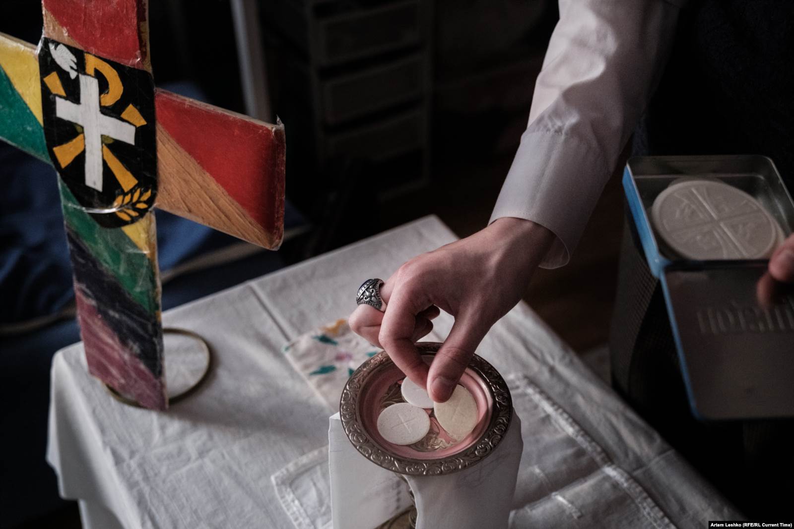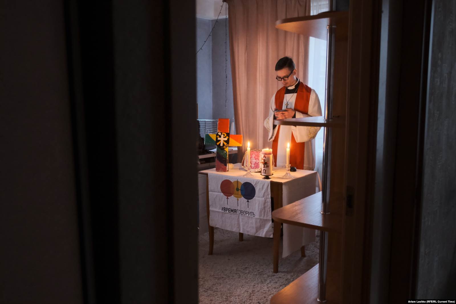 На столе перед Александром – ноутбук с фотографией Мартина Лютера Кинга и цитатой "I have a dream..." на заставке. Священник раздает прихожанам распечатки молитв. Портативная колонка, из которой доносятся гимны. Разноцветный крест, скатерть, чаша для богослужений.