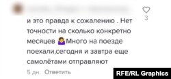 Пользовательница тиктока из города Завитинск Амурской области, написавшая в комментарии, что ее единственный сын уезжает "в командировку на границу России", уточнила в переписке с Радио Свобода, что военные эшелоны отправлялись три дня подряд – с 9 по 11 января. Их прибытие "под Брянск", по ее словам, ожидается к концу месяца: